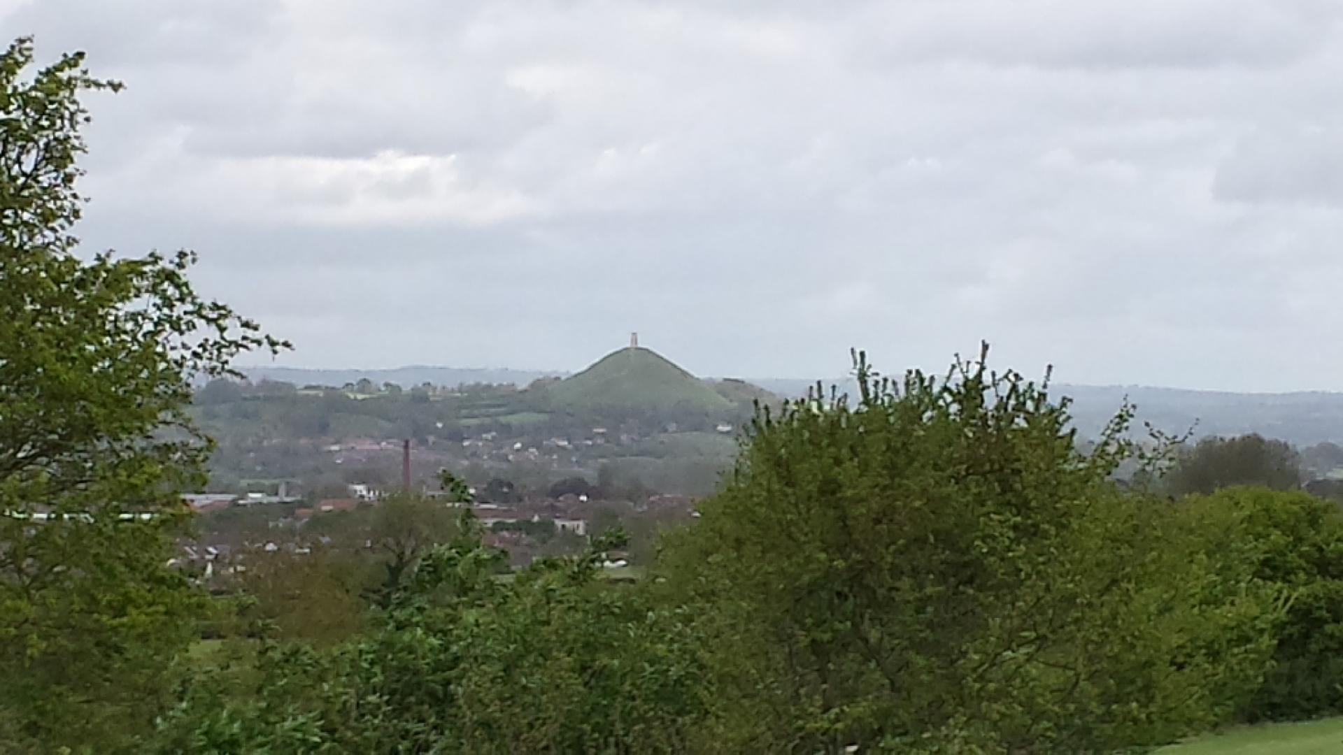 Late in the morning I catch a glimpse of Glastonbury Tor (a conical hill topped by the roofless St Michael's Tower).