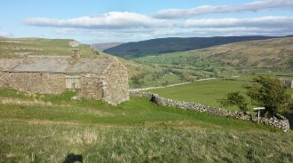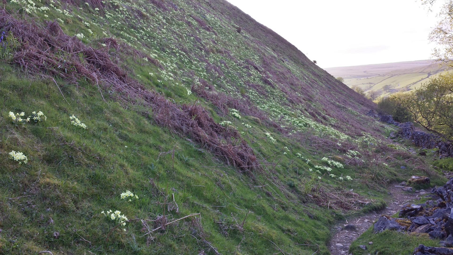 I get to Hawes around 1.30 and get some refreshments in a bikers cafe. It's a pleasant place with a market today. It's too early to stop so I decide to head for Keld, via Great Shunner Fell (2350 feet). The climb is relatively gentle. By 7 pm I'm walking high up on one side of the valley of the River Swale which leads to Keld. At one point the side of the valley is completely yellow with primroses.