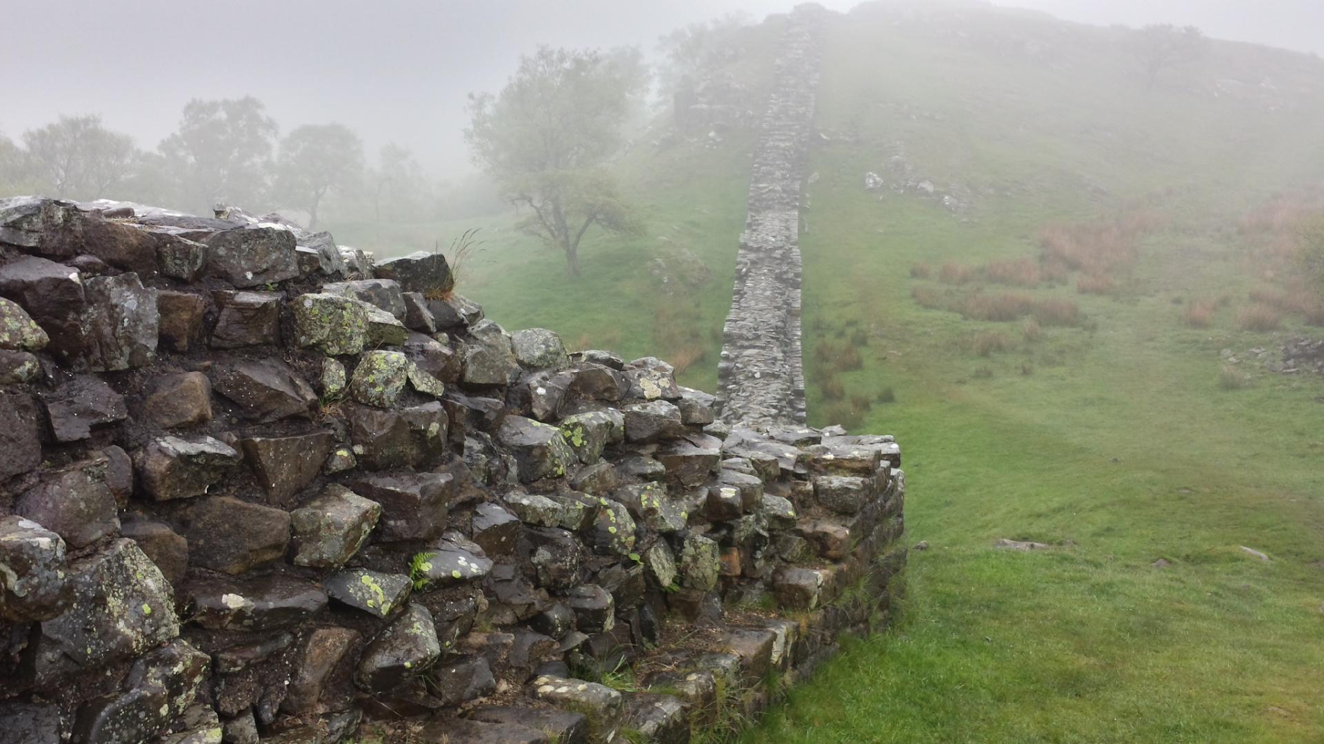 Suddenly, there it is: Hadrian's Wall. I've been walking for thirty to forty minutes or so, climbing gently. It's quite misty, unlike the sunny day last time I was here, which seems to generate a more appropriate atmosphere for this special place.