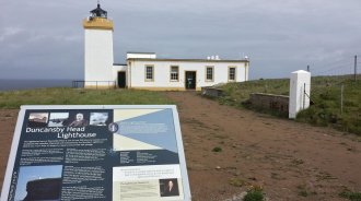 Eventually I crested Giar Hill and there in the distance were the Orkney Islands. To the right was Duncansby Head with its lighthouse. After enjoying myself at the little harbour and assorted attractions of John o'Groats, I walked back up the road and headed East to Duncansby Head - it's a couple of miles to the extreme north east tip of Scotland. A camper van went past, I stuck out my thumb, and got a lift. There were two couples and a dog on board - Ann, Janet, John, George, and Ned. They were there to meet their son and daughter who had also just finished LEJOG.