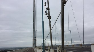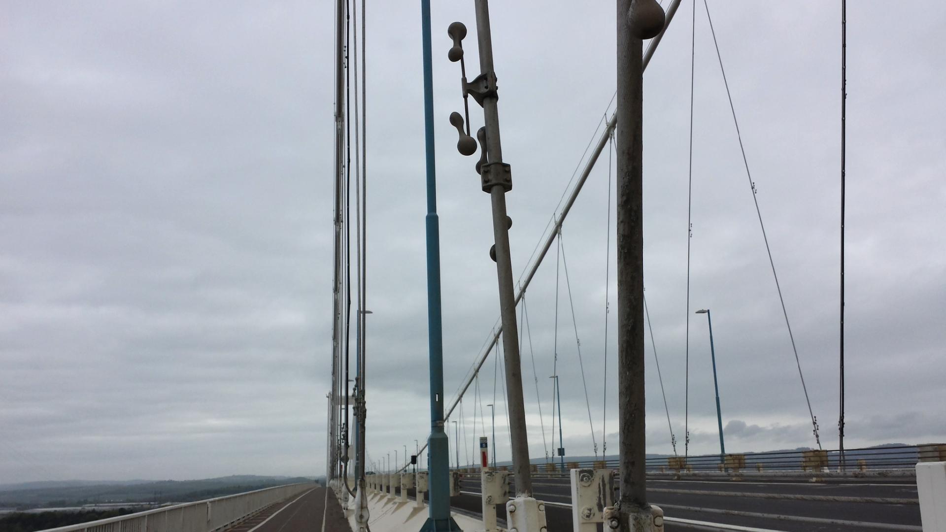 We're walking over the older Severn bridge now. Some of the down cables have strange metal objects clamped to them (photo below). I would really like to know what these are. Anyone know? Nigel? Ken? Tim? Mike? They aren't present on the shorter cables, and don't have anything connecting to them. A mystery - for now.