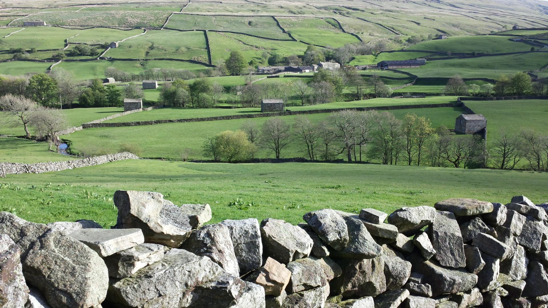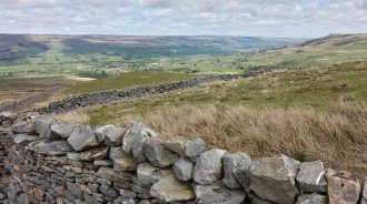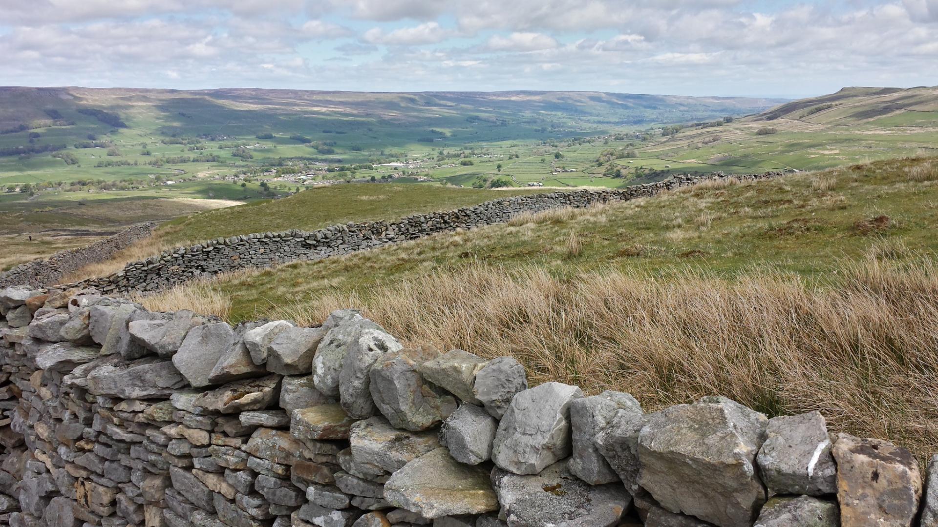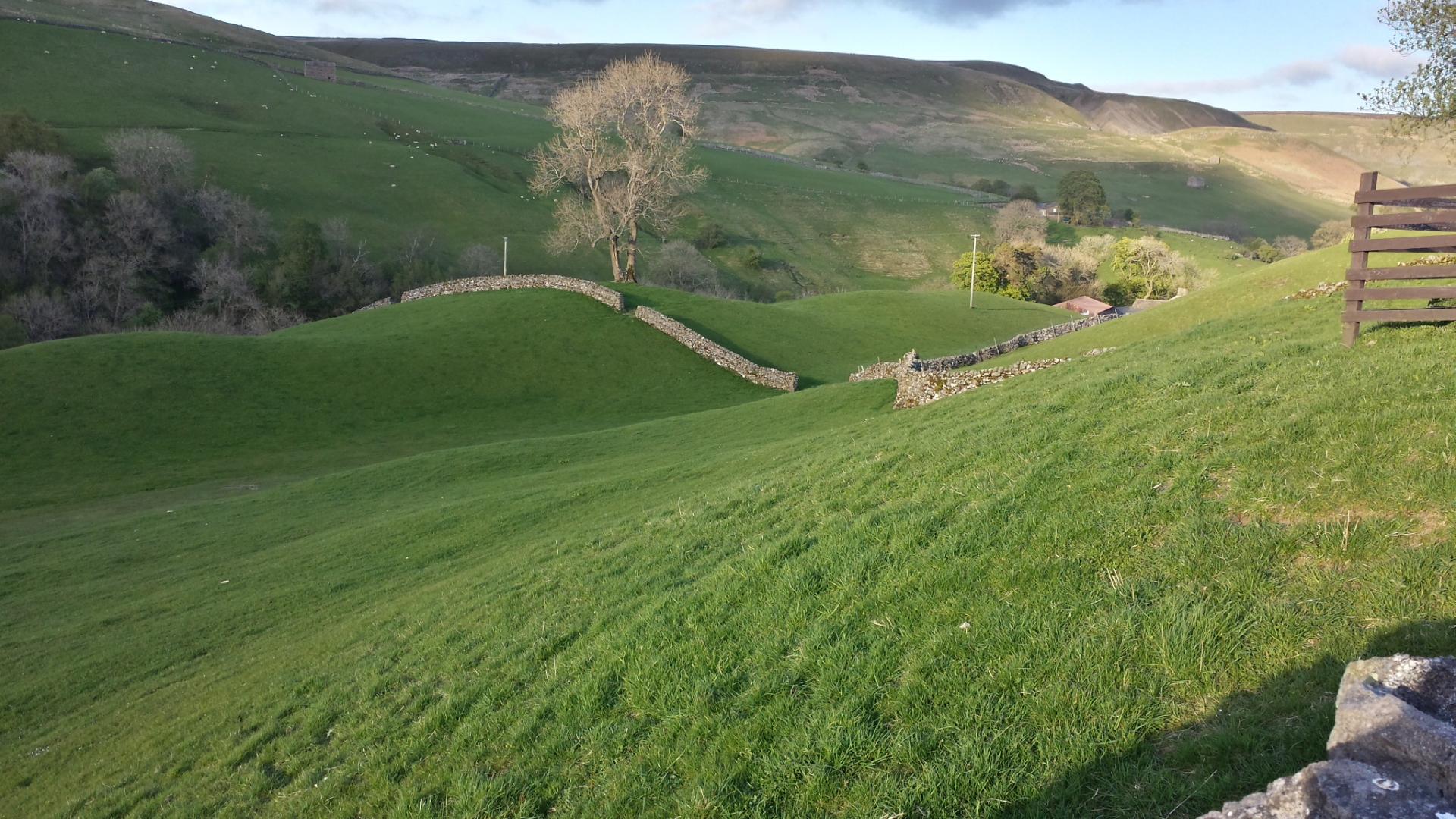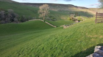 I get to Hawes around 1.30 and get some refreshments in a bikers cafe. It's a pleasant place with a market today. It's too early to stop so I decide to head for Keld, via Great Shunner Fell (2350 feet). The climb is relatively gentle. By 7 pm I'm walking high up on one side of the valley of the River Swale which leads to Keld. At one point the side of the valley is completely yellow with primroses.