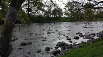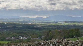 What is it about barbed wire? I don't get it. At one point there is a field of sheep to the left, fenced with a double strand of barbed wire on top. Trees and the river are on my right, leaving a quite narrow path. It would be all too easy to catch clothing, back pack or skin on the wire, which is also at a child's eye level. Surely ordinary wire would be equally effective? Enough moaning, as I meet two gentlemen out for a walk on the hills, looking for spring gentian. One of them, Brian Carter, asks about my walk and kindly makes a donation to the fund. What a nice man. I, of course, forget to take a photo.
