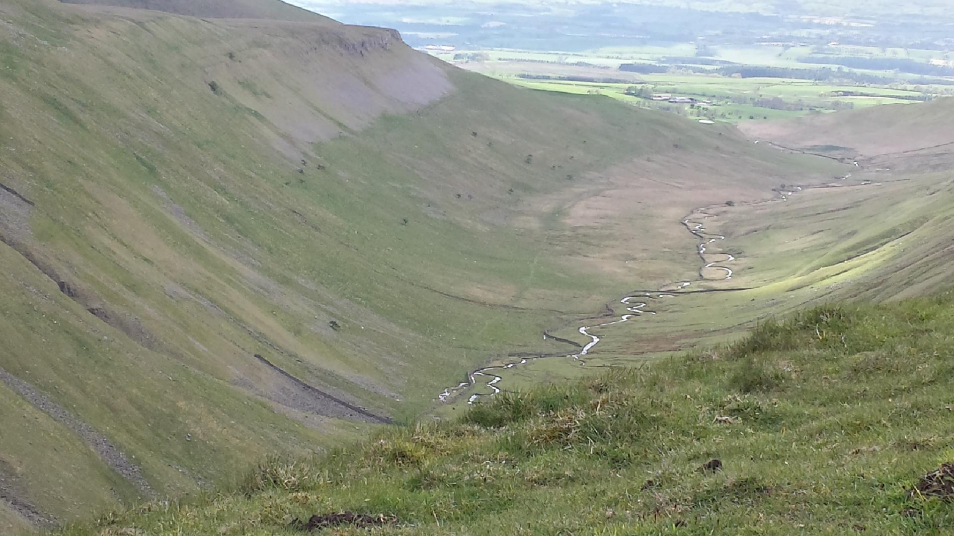 I knew that the long slog would be rewarded, and I was not disappointed. Suddenly the desolate moorland disappeared, and spread out before me is a deep, narrow valley: High Cup Nick. In the distance is the lush Eden Valley, and beyond that the mountains of the Lake District. It is truly a wonderful view.