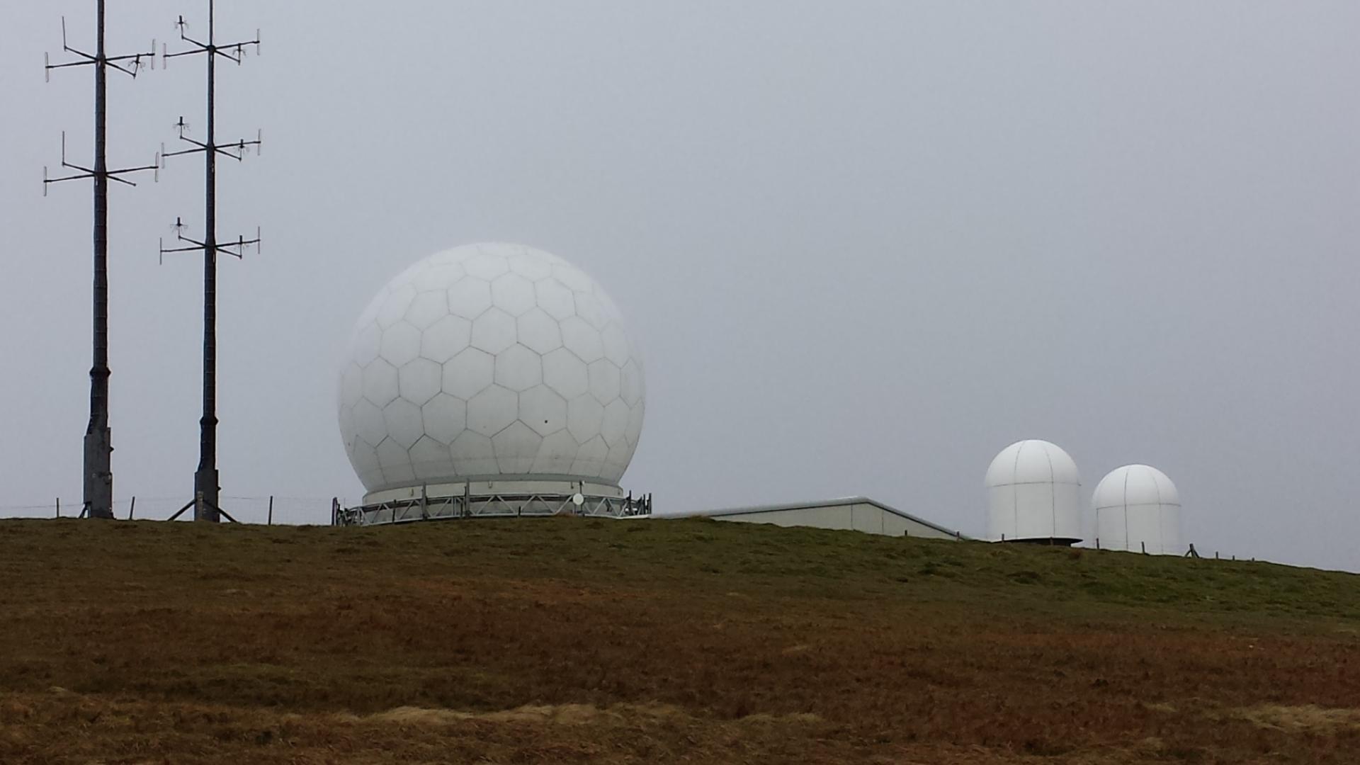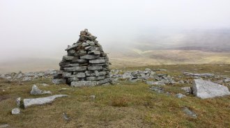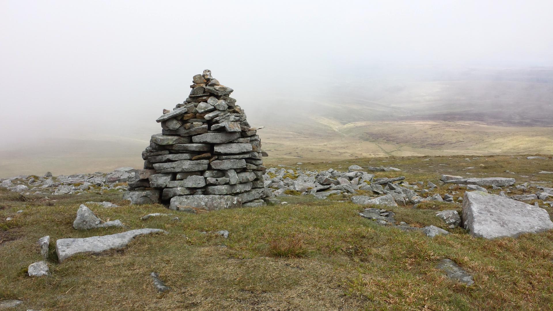 The path leads ever upwards, past Knock Fell, Great Dun Fell with ita ghostly radar globe, Little Dun Fell and finally Cross Fell at 2930 feet. The cloud occasionally parts and gives me tantalising glimpses of the views I'm mostly unable to see. On a clear day it's possible to see the sea and, to the north, the hills of Galloway in Scotland. The weather plays games, and in the space of ten minutes there is weak sun, rain, and, at the highest point, sleety snow. Mercifully, the Helm Wind, notorious at Cross Fell, is absent.