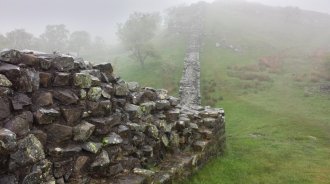 Suddenly, there it is: Hadrian's Wall. I've been walking for thirty to forty minutes or so, climbing gently. It's quite misty, unlike the sunny day last time I was here, which seems to generate a more appropriate atmosphere for this special place.