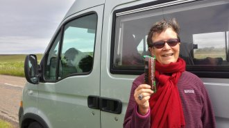 Rejoining the road I shook hands with a couple of cyclists returning home after finishing yesterday. The road was ok, not too busy, and the weather was almost dry. A camper van stopped ahead of me and it was the woman from the beach and her husband. Ulla (originally from Denmark) produced an ice cream - would I like it? It was heavenly. I'd told her earlier about David, who had set off later than me from June's b&b. She'd passed him, but couldn't stop on that section of the road. Would I like another ice cream, technically David's? It was just as good as the first. I waved them off with profuse thanks.