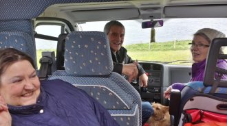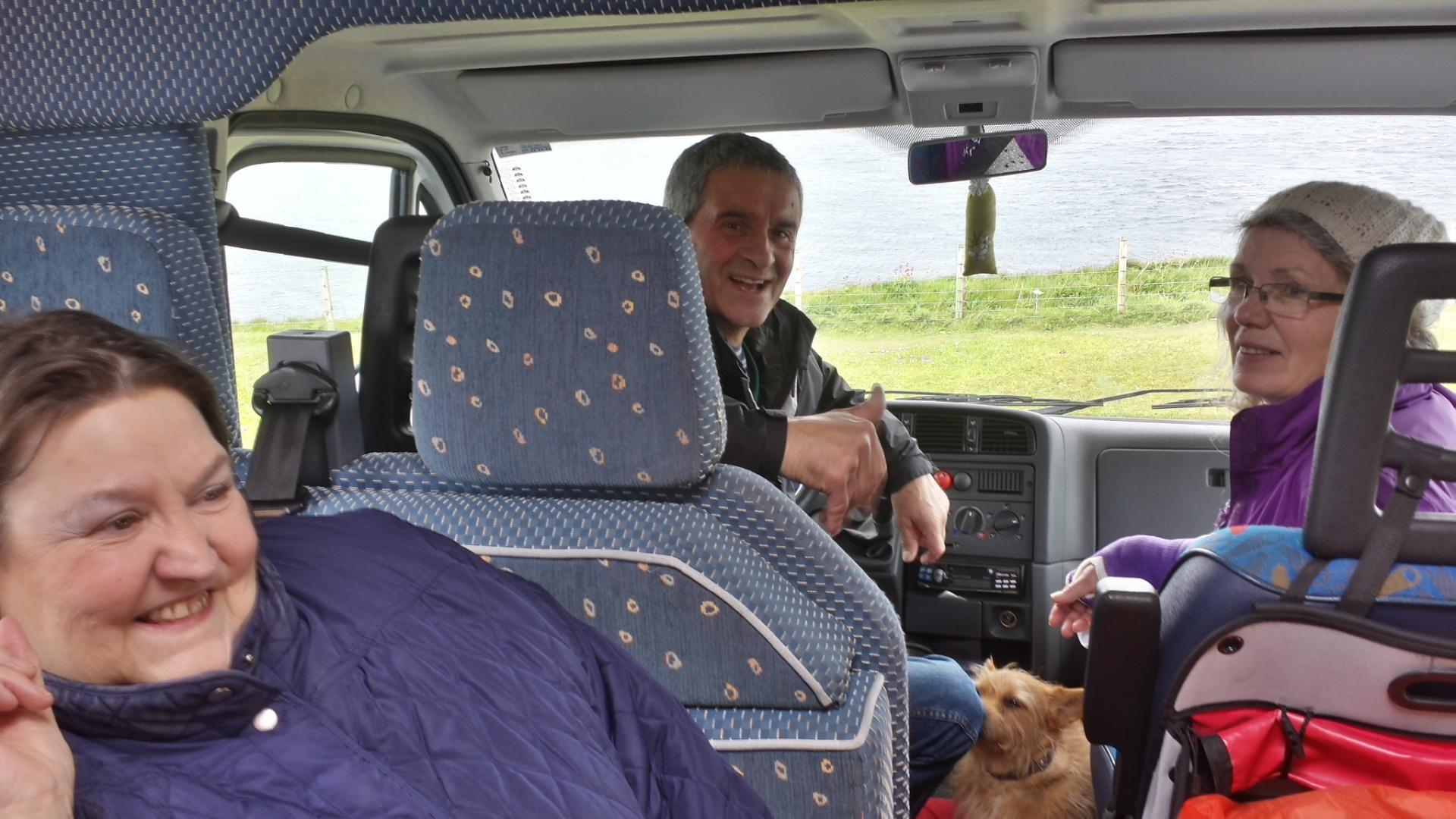 Eventually I crested Giar Hill and there in the distance were the Orkney Islands. To the right was Duncansby Head with its lighthouse. After enjoying myself at the little harbour and assorted attractions of John o'Groats, I walked back up the road and headed East to Duncansby Head - it's a couple of miles to the extreme north east tip of Scotland. A camper van went past, I stuck out my thumb, and got a lift. There were two couples and a dog on board - Ann, Janet, John, George, and Ned. They were there to meet their son and daughter who had also just finished LEJOG.